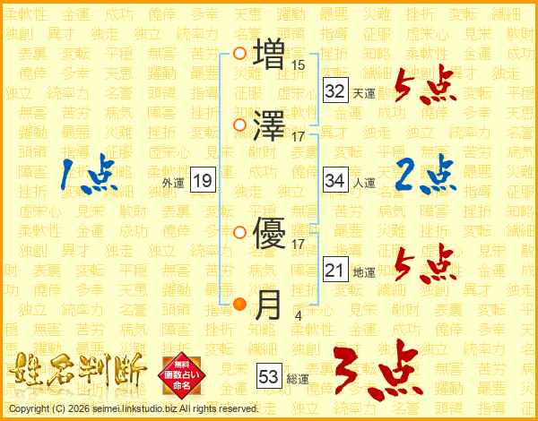 増(15画)澤(17画) 優(17画)月(4画)