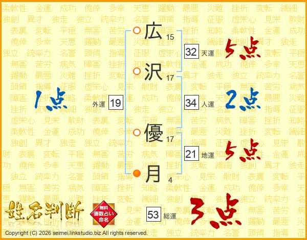 生活面を象徴する運勢です。外部から受ける影響力を表し、結婚運、家庭運や職場、環境への順応性を表します。総運から人運を引いた画数。姓や名が1文字の場合を除く。