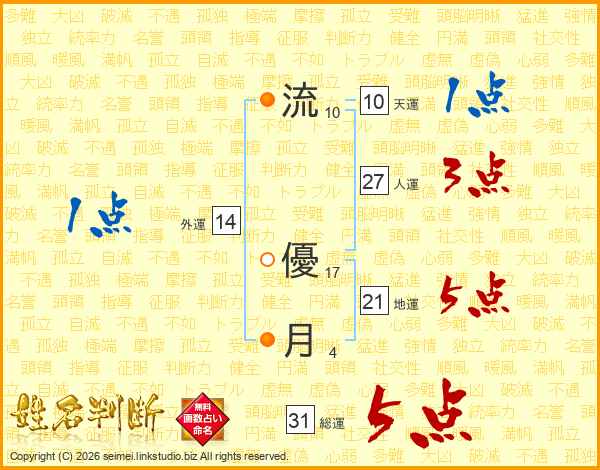 生活面を象徴する運勢です。外部から受ける影響力を表し、結婚運、家庭運や職場、環境への順応性を表します。総運から人運を引いた画数。姓や名が1文字の場合を除く。