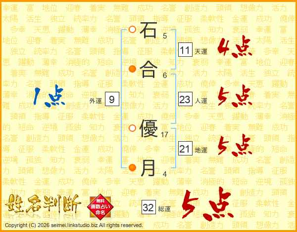 生活面を象徴する運勢です。外部から受ける影響力を表し、結婚運、家庭運や職場、環境への順応性を表します。総運から人運を引いた画数。姓や名が1文字の場合を除く。