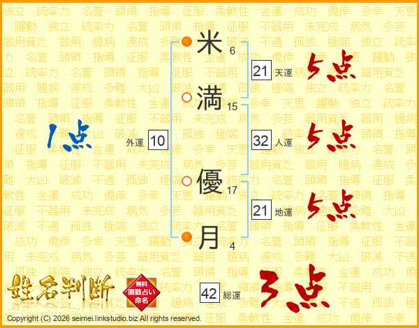 米(6画)満(15画) 優(17画)月(4画)