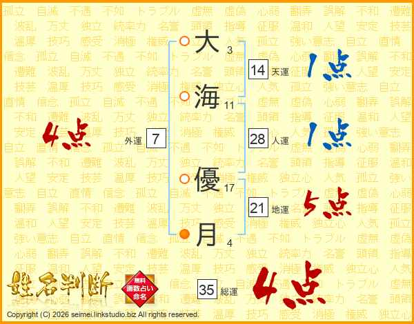 生活面を象徴する運勢です。外部から受ける影響力を表し、結婚運、家庭運や職場、環境への順応性を表します。総運から人運を引いた画数。姓や名が1文字の場合を除く。