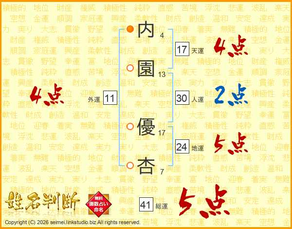 内(4画)園(13画) 優(17画)杏(7画)