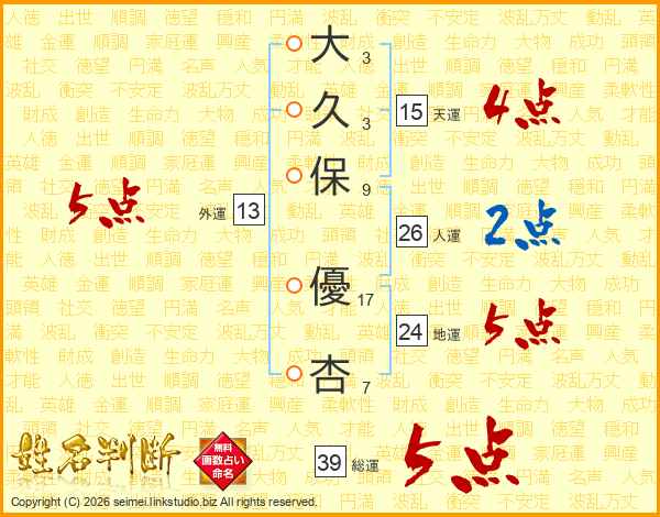 大(3画)久(3画)保(9画) 優(17画)杏(7画)
