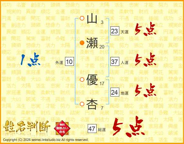 山(3画)瀬(20画) 優(17画)杏(7画)