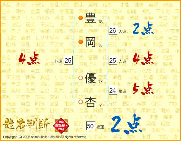 豊(18画)岡(8画) 優(17画)杏(7画)