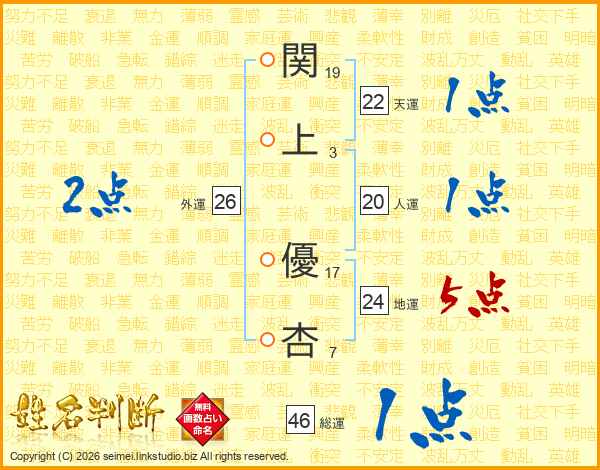 関(19画)上(3画) 優(17画)杏(7画)