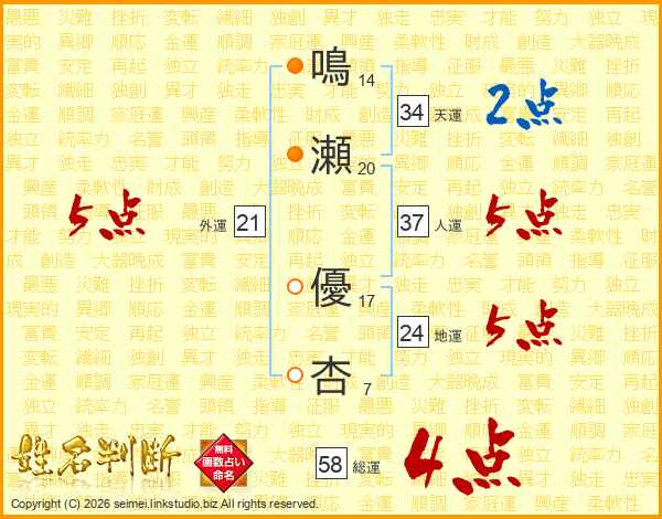 鳴瀬優杏さんの総運は58画の4点!