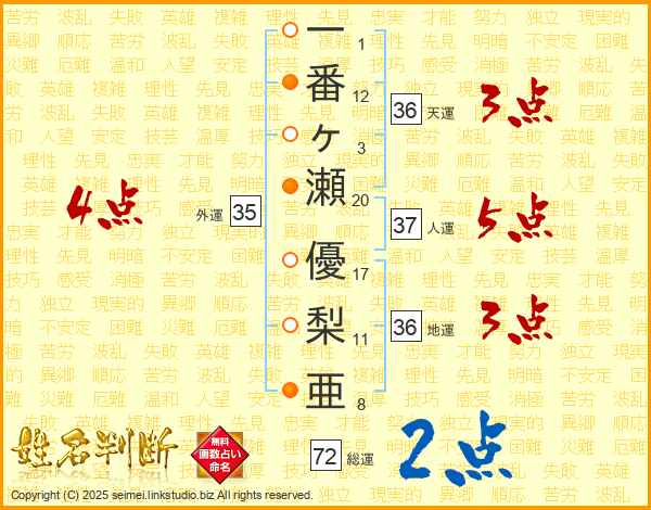 一番ヶ瀬優梨亜さんの総運は72画の2点!