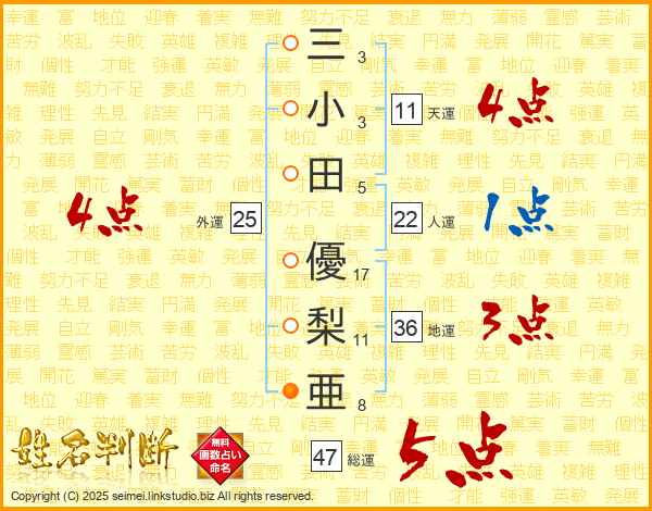 三(3画)小(3画)田(5画) 優(17画)梨(11画)亜(8画)