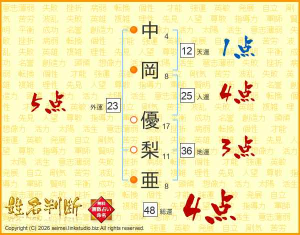 中岡優梨亜さんの総運は48画の4点!
