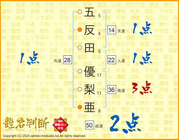 五(5画)反(4画)田(5画) 優(17画)梨(11画)亜(8画)