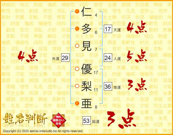 仁(4画)多(6画)見(7画) 優(17画)梨(11画)亜(8画)