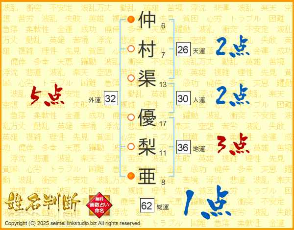 仲(6画)村(7画)渠(13画) 優(17画)梨(11画)亜(8画)