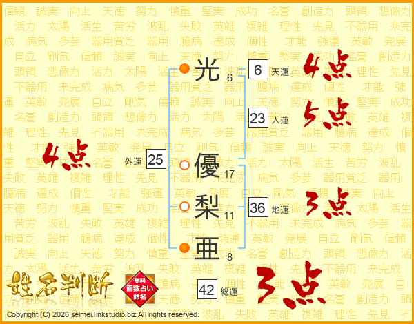 光(6画) 優(17画)梨(11画)亜(8画)