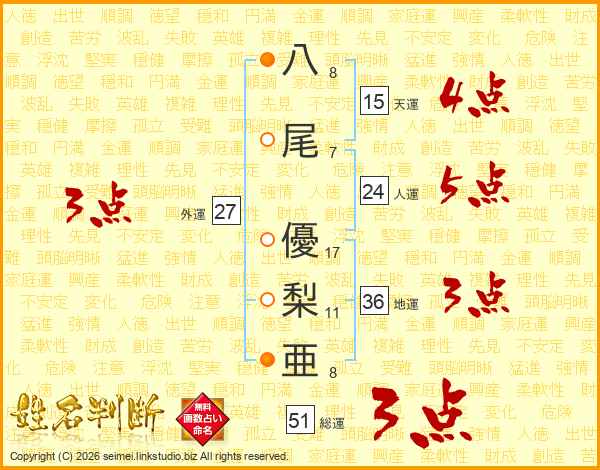 八(8画)尾(7画) 優(17画)梨(11画)亜(8画)