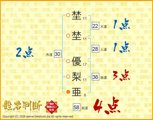 埜埜優梨亜さんの総運は58画の4点!