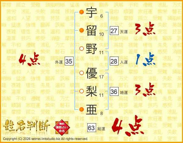 宇留野優梨亜さんの総運は63画の4点!