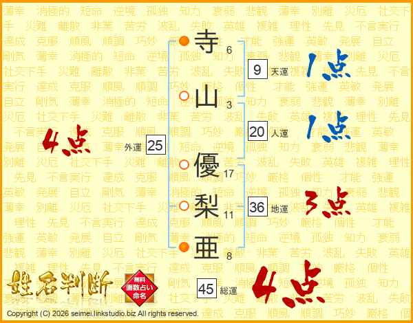 寺(6画)山(3画) 優(17画)梨(11画)亜(8画)
