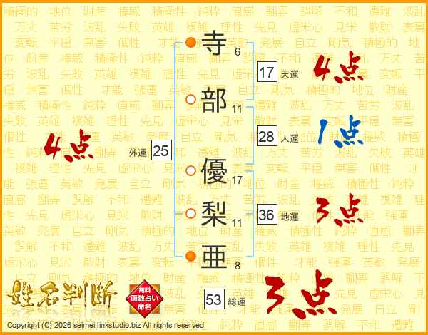 寺(6画)部(11画) 優(17画)梨(11画)亜(8画)