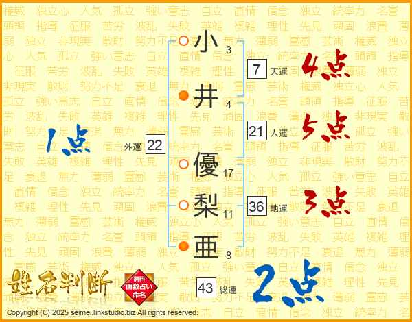 小(3画)井(4画) 優(17画)梨(11画)亜(8画)