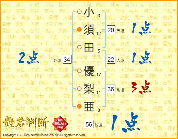 小(3画)須(12画)田(5画) 優(17画)梨(11画)亜(8画)