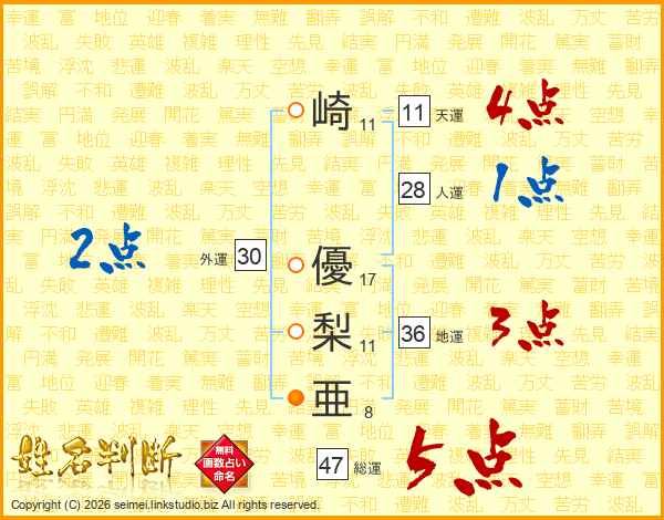 崎(11画) 優(17画)梨(11画)亜(8画)