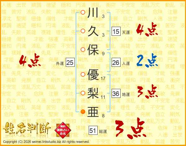 川(3画)久(3画)保(9画) 優(17画)梨(11画)亜(8画)