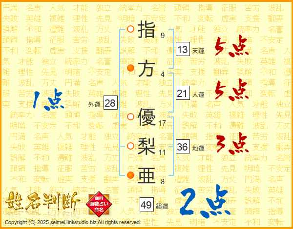 指(9画)方(4画) 優(17画)梨(11画)亜(8画)
