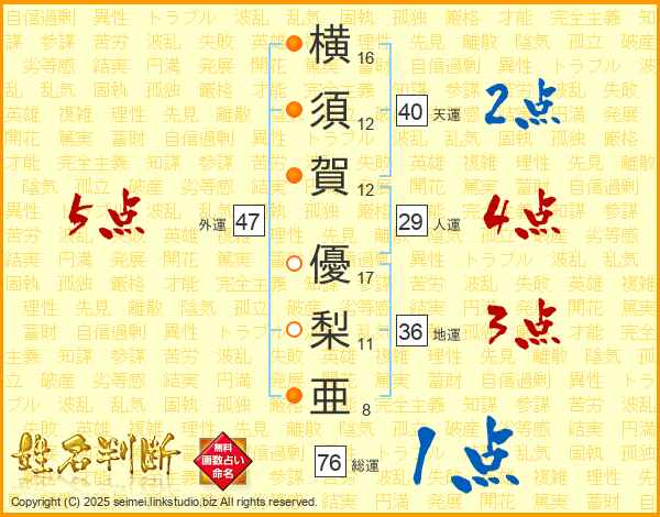 横(16画)須(12画)賀(12画) 優(17画)梨(11画)亜(8画)