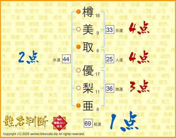 樽(16画)美(9画)取(8画) 優(17画)梨(11画)亜(8画)