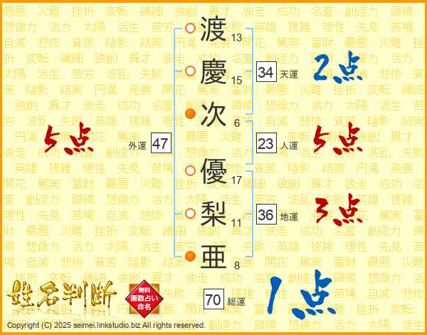 渡(13画)慶(15画)次(6画) 優(17画)梨(11画)亜(8画)
