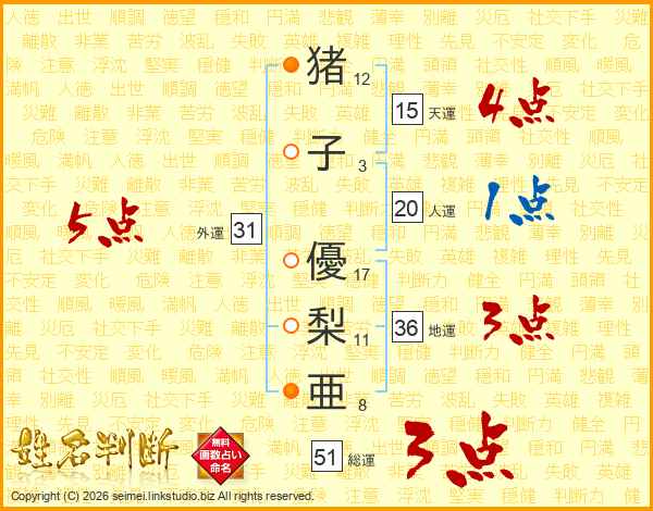 猪子優梨亜さんの外運は31画の5点!