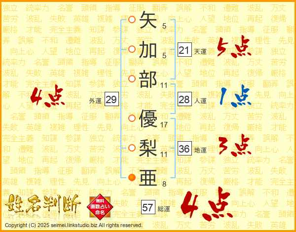 矢(5画)加(5画)部(11画) 優(17画)梨(11画)亜(8画)