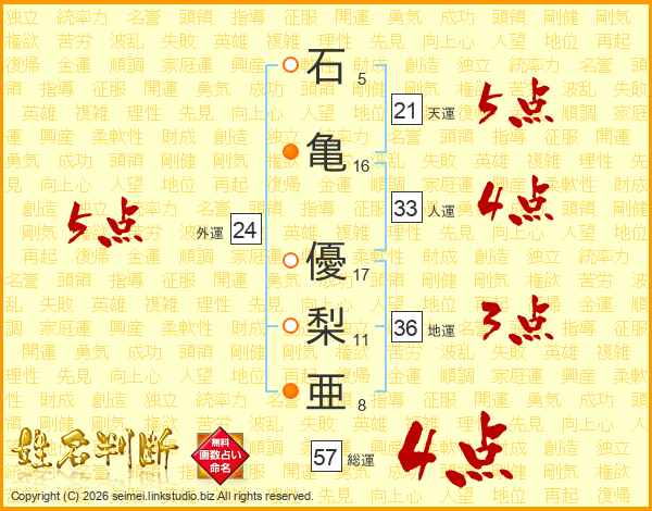 石(5画)亀(16画) 優(17画)梨(11画)亜(8画)