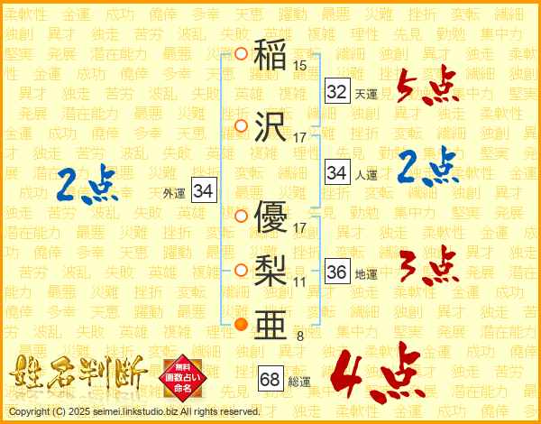 稲(15画)沢(17画) 優(17画)梨(11画)亜(8画)