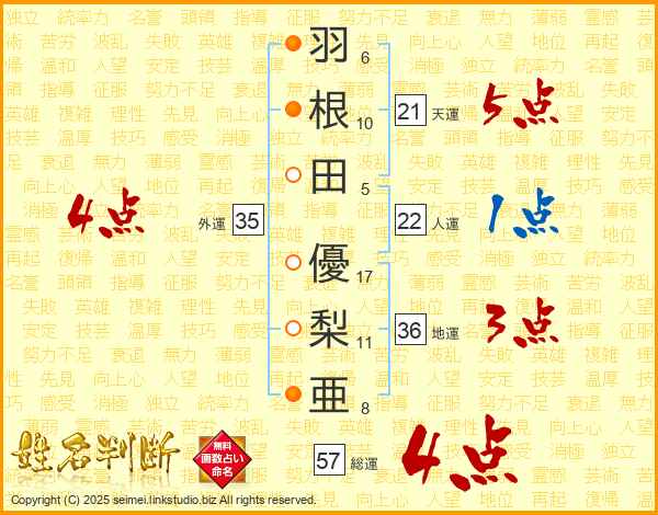 羽根田優梨亜さんの総運は57画の4点!