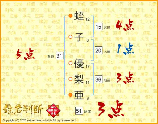 蛭子優梨亜さんの総運は51画の3点!