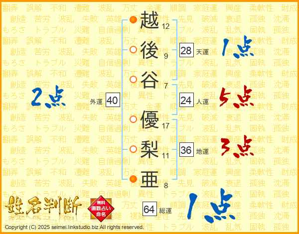 越(12画)後(9画)谷(7画) 優(17画)梨(11画)亜(8画)