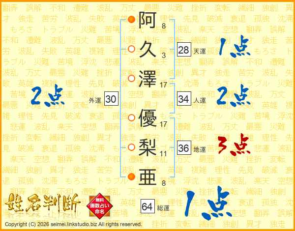 阿(8画)久(3画)澤(17画) 優(17画)梨(11画)亜(8画)