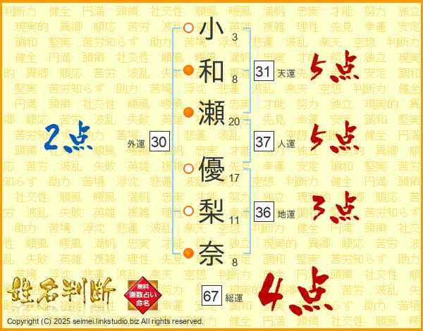 小(3画)和(8画)瀬(20画) 優(17画)梨(11画)奈(8画)