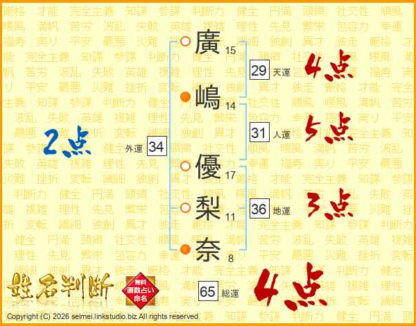 廣(15画)嶋(14画) 優(17画)梨(11画)奈(8画)