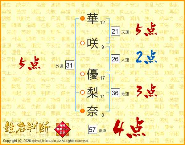 華(12画)咲(9画) 優(17画)梨(11画)奈(8画)