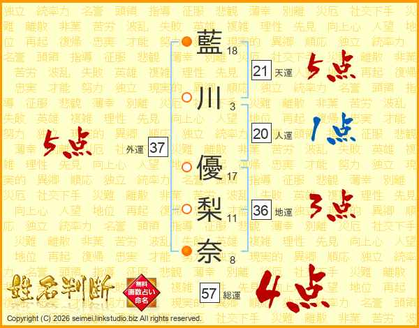 藍(18画)川(3画) 優(17画)梨(11画)奈(8画)