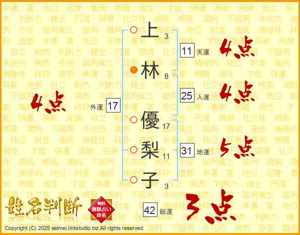 上(3画)林(8画) 優(17画)梨(11画)子(3画)