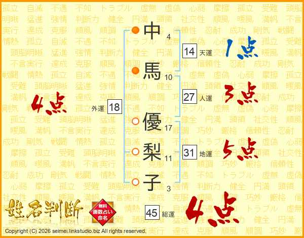 中(4画)馬(10画) 優(17画)梨(11画)子(3画)