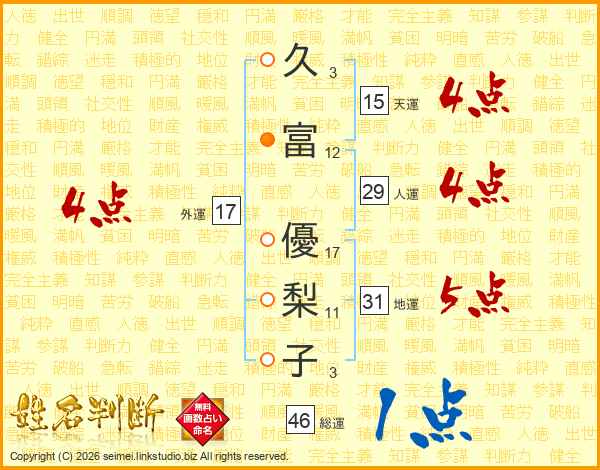 久(3画)富(12画) 優(17画)梨(11画)子(3画)