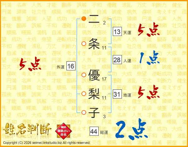 二条優梨子さんの総運は44画の2点!