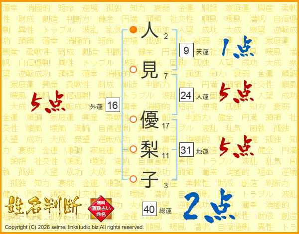 人(2画)見(7画) 優(17画)梨(11画)子(3画)