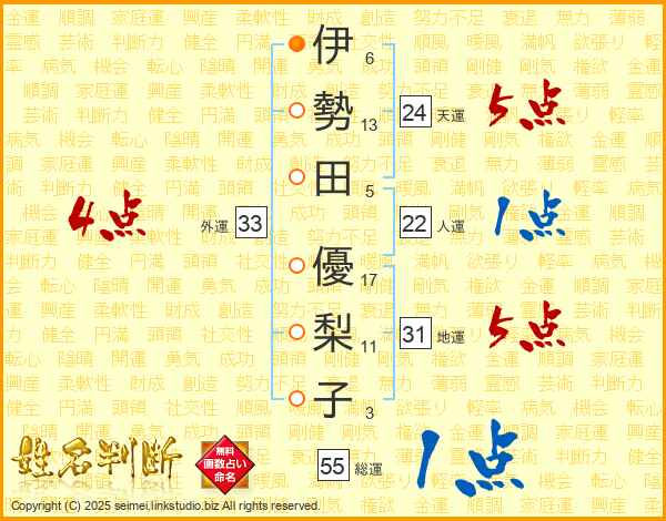 伊(6画)勢(13画)田(5画) 優(17画)梨(11画)子(3画)